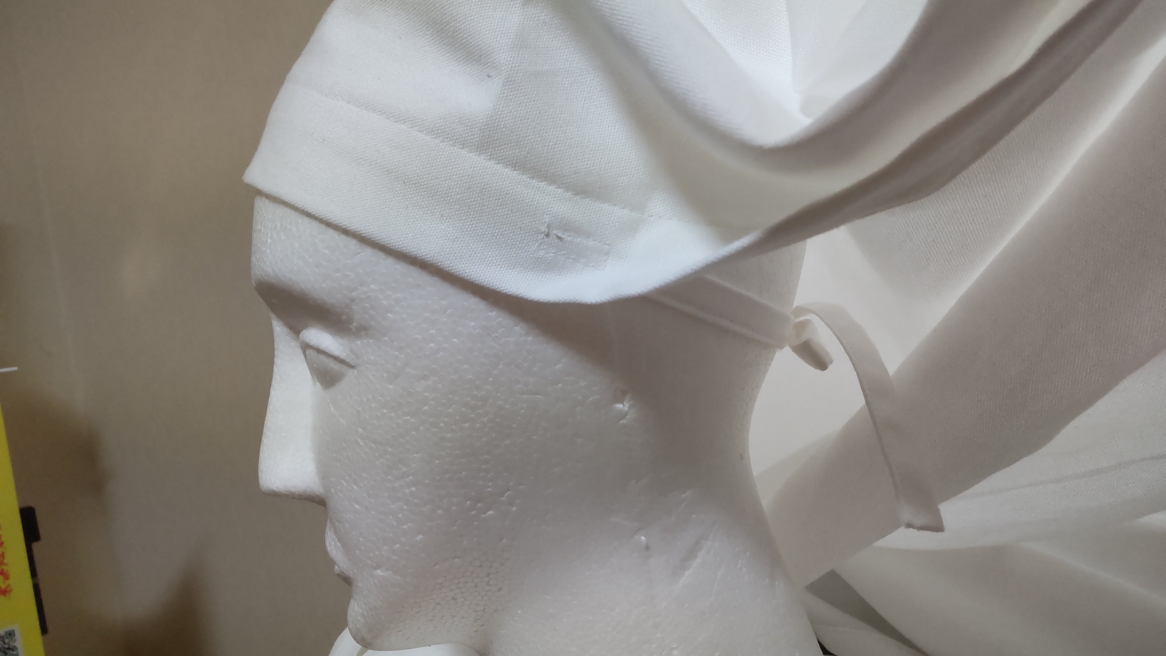 額の両サイド裏側の紐で縛り、頭巾全体を調整します。